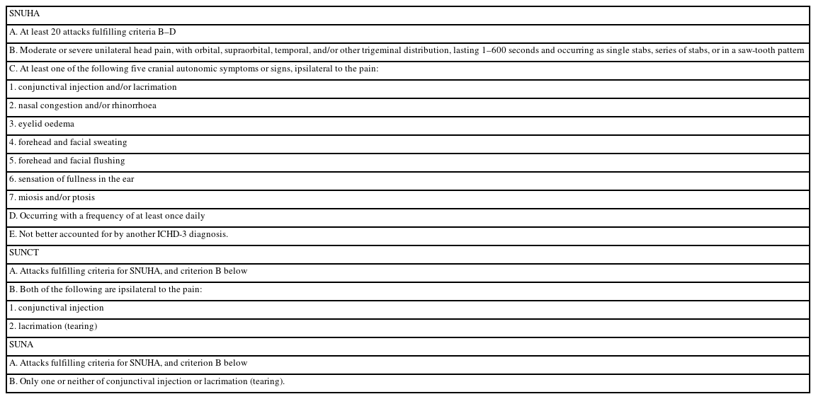 SUNCT, short-lasting unilateral neuralgiform headache attacks with conjunctival injection and tearing; SUNA, short-lasting unilateral neuralgiform with cranial autonomic symptoms; ICHD-3, International Classification of Headache Disorders, third edition; SNUHA, short-lasting unilateral neuralgiform headache attacks.