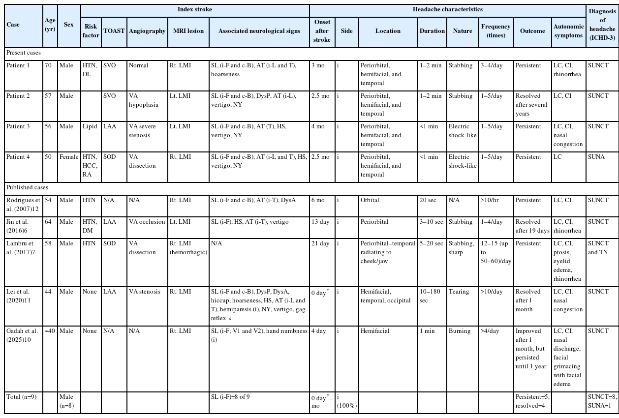 | Jin et al. (2016)6 | 64 | Male | HTN, DM | LAA | VA occlusion | Lt. LMI | SL (i-F), HS, AT (i-T), vertigo | 13 day | i | Periorbital | 3–10 sec | Stabbing | 1–4/day | Resolved after 19 days | LC, CI, rhinorrhea | SUNCT |