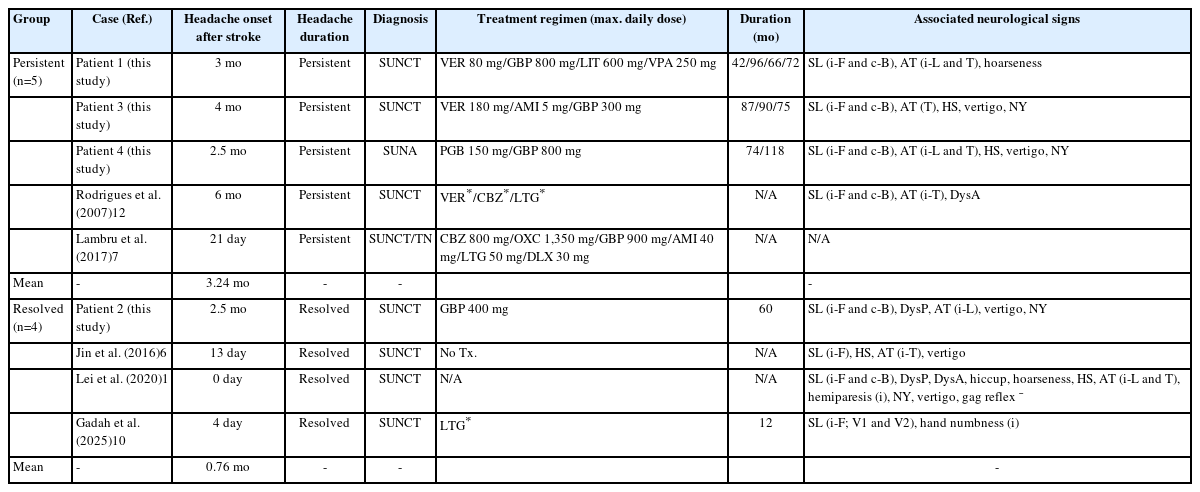 | Group | Case (Ref.) | Headache onset after stroke | Headache duration | Diagnosis | Tx. regimen (max. daily dose) | Duration (mo) | Associated neurological signs |