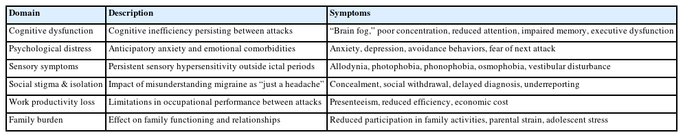 | HIT-6 | Headache impact and disability | Pain, fatigue, cognitive impairment, role limitation | Not interictal-specific, indirect measure |