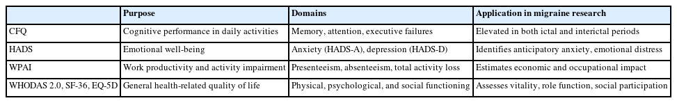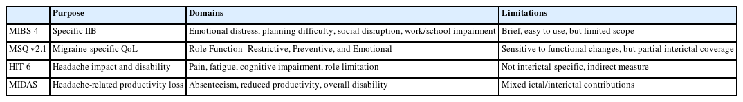 | MIDAS | Headache-related productivity loss | Absenteeism, reduced productivity, overall disability | Mixed ictal/interictal contributions |