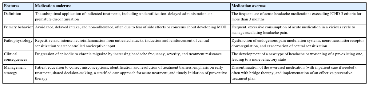 | Definition | The suboptimal application of indicated treatments, including underutilization, delayed administration, or premature discontinuation | The frequent use of acute headache medications exceeding ICHD-3 criteria for more than 3 months |