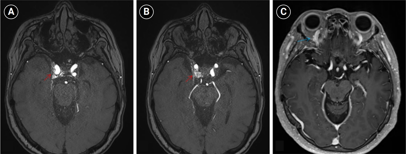 Brain magnetic resonance imaging (MRI) findings. (A, B) Non-contrast time-of-flight magnetic resonance angiography shows a high flow-related signal (red arrows) within the right cavernous sinus. (C) Contrast-enhanced T1-weighted MRI demonstrates asymmetric dilation of the superior ophthalmic veins (blue arrow), more prominent on the right.