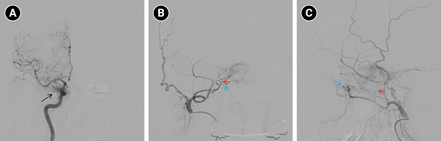 Digital subtraction angiography findings in the patient. (A) Right internal carotid artery (ICA) angiogram shows an indirect carotid-cavernous fistula supplied by the meningohypophyseal trunk of the cavernous ICA (black arrow). (B, C) Right external carotid artery angiogram demonstrates additional arterial supply from external carotid branches, including the internal maxillary artery (blue arrows) and the cavernous branch of the middle meningeal artery (red arrows).