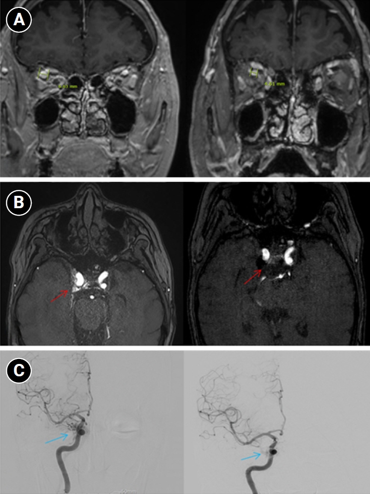 Imaging changes before and after embolization. (A) Brain magnetic resonance imaging (coronal section through the orbits) shows a decrease in the diameter of the right superior ophthalmic vein from 6.63 mm pre-embolization to 4.61 mm post-embolization, indicating reduced venous congestion. (B) Axial time-of-flight magnetic resonance angiography demonstrates that flow-related hyperintensity within the right cavernous sinus is markedly reduced after embolization (red arrows), consistent with decreased shunt flow. (C) Digital subtraction angiography images before embolization show abnormal early pericavernous venous filling along the right cavernous sinus region (blue arrows), compatible with carotid-cavernous shunting. On follow-up, this abnormal filling is no longer visualized, consistent with interval reduction in shunt flow.