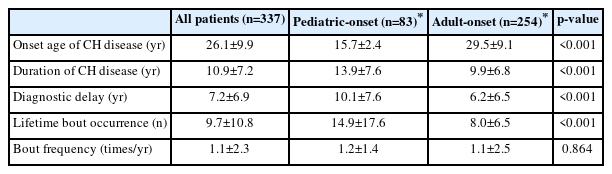 Values are presented as mean±standard deviation. CH, cluster headache. Pediatric-onset was defined as onset age 18 years or less, and adult-onset was defined as onset age more than 18 years.