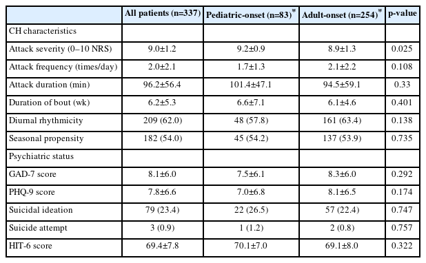 Values are presented as mean±standard deviation or number (%). CH, cluster headache; NRS, numerical rating scale; GAD-7, 7-item Generalized Anxiety Disorder scale; PHQ-9, 9-item Patient Health Questionnaire scale; HIT-6, 6-item Headache Impact Test. Pediatric-onset was defined as onset age 18 years or less, and adult-onset was defined as onset age more than 18 years.