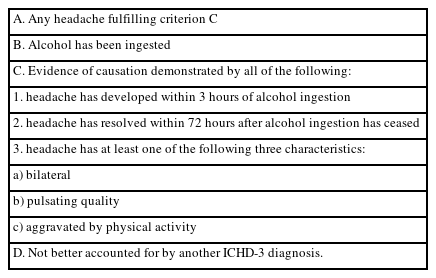| 1. headache has developed within 3 hours of alcohol ingestion |