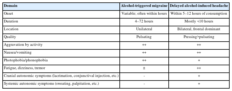 | Domain | Alcohol-triggered migraine | Delayed alcohol-induced headache |