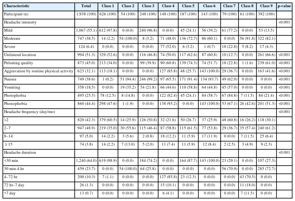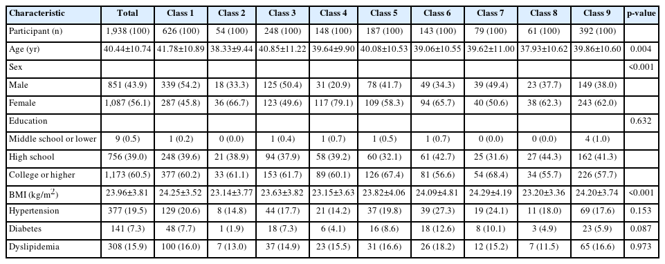 | Characteristic | Total | Class 1 | Class 2 | Class 3 | Class 4 | Class 5 | Class 6 | Class 7 | Class 8 | Class 9 | p-value |