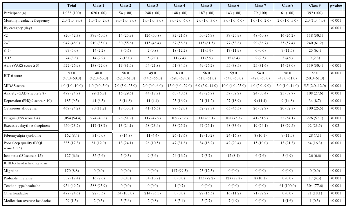 | Monthly headache frequency | 2.0 (1.0–3.0) | 1.0 (1.0–2.0) | 3.0 (1.0–7.0) | 1.0 (1.0–3.0) | 3.0 (2.0–6.0) | 2.0 (1.0–3.0) | 3.0 (1.0–6.0) | 1.0 (1.0–2.0) | 2.0 (1.0–5.0) | 2.0 (1.0–4.0) | <0.001 | |